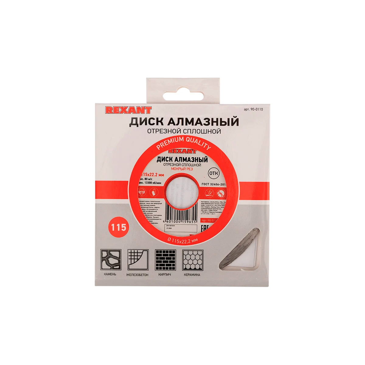 Круг отрезной 115x22.23х1,8x10мм алмазный сплошной Rexant 90-0110