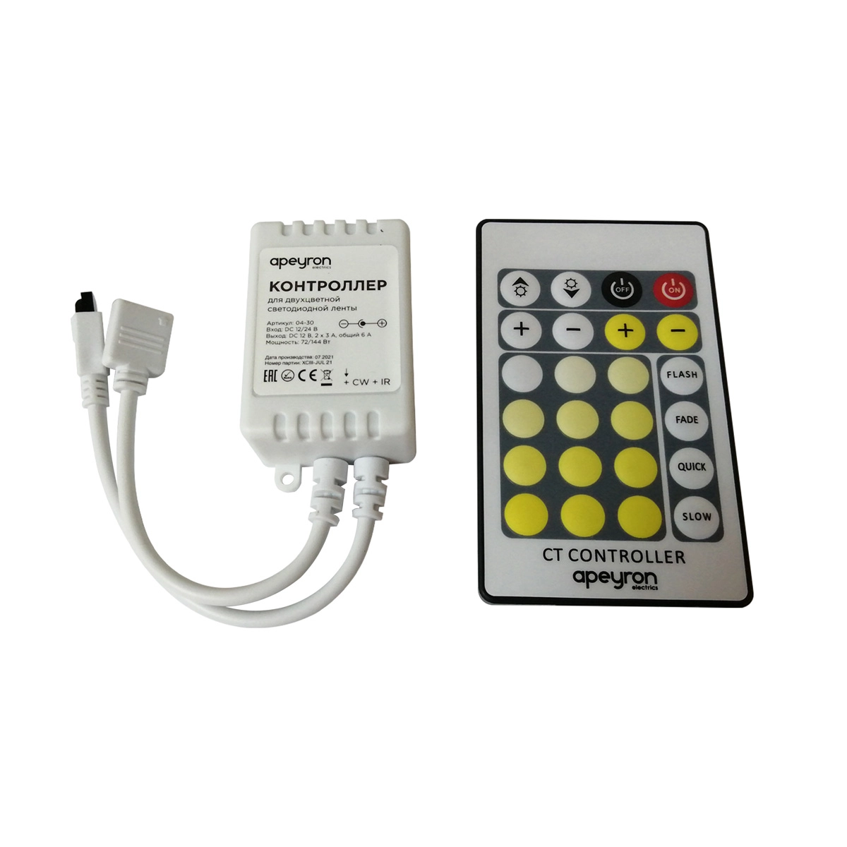 Контроллер CCT 04-30 предназначен для управления светодиодной лентой CCT 12/24 В. С помощью него можно регулировать цветовые оттенки, включать или выключать светодиодную ленту, выбирать различные динамические режимы свечения светодиодной ленты, регулировать яркость. Прибор позволит отрегулировать свечение: создать как свечение бодрящих холодных оттенков, способствующих утреннему пробуждению и концентрации, так и успокаивающих цветов свечения теплых оттенков, которые способствуют успокоению нервной системы и расслаблению. Прибор может работать как от напряжения 12 В, так и 24 В. Прибор укомплектован дистанционным пультом управления, передающий сигнал по инфракрасному каналу. Пластиковый накладной размер 50х28х13 мм. Степень защиты от пыли и влаги соответствует стандарту IP33, что подразумевает установку устройства в сухом, проветриваемом помещении. В комплекте: контроллер, кнопочный ИК-пульт, 4-игольчатый коннектор для выхода.