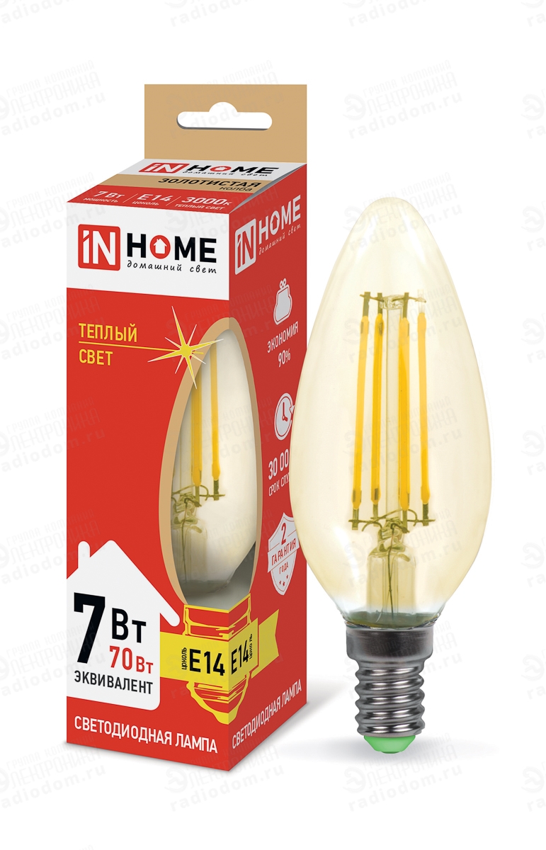 Модель серии Deco IN HOME представленная в форме золотистой прозрачной свечи оснащена нитевым излучателем, имитирующим лампу накаливания, идеально подойдет для вашего интерьера, подчеркивая ваш светильник не только качественным светом, но и лаконичным, классическим видом пламени свечи.