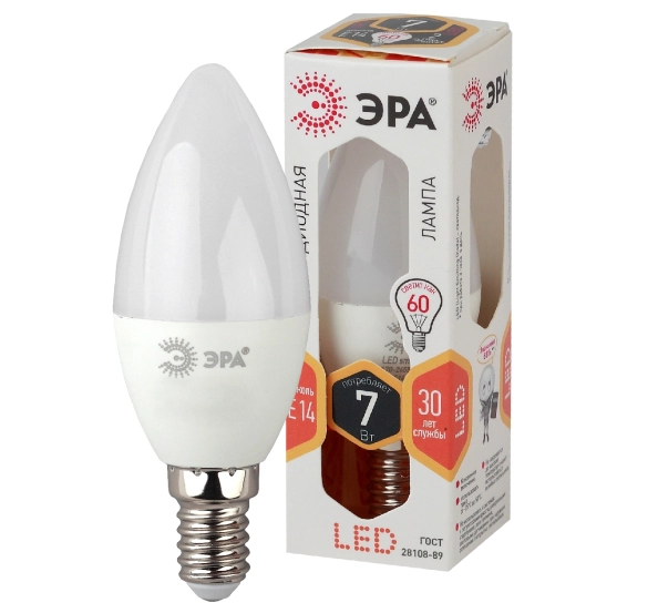 Лампа светодиодная ЭРА STD LED B35-7W-827-E14 7Вт свеча теплый белый свет Е14